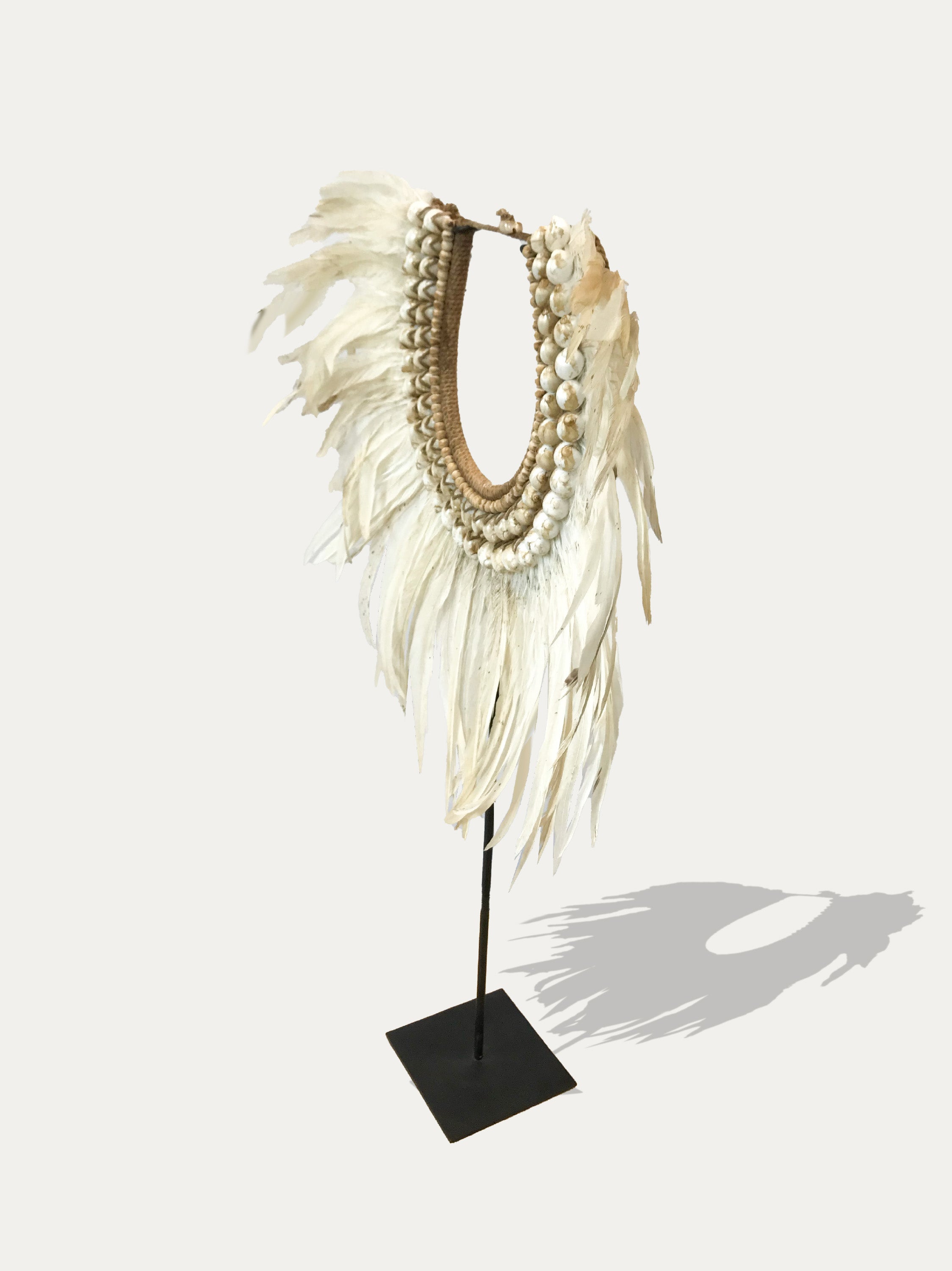 Ce collier provient de Papouasie en Indonésie et est composé de plumes de coq et de coquillages brodés sur une base de crochet en fibres naturelles. C'était un symbole du lien entre l'homme et la nature, utilisé lors de grandes cérémonies. Dans plusieurs mythes, le coq a le pouvoir de ressusciter les morts ou de réaliser un vœu. Il est considéré comme sacré dans le monde spirituel.