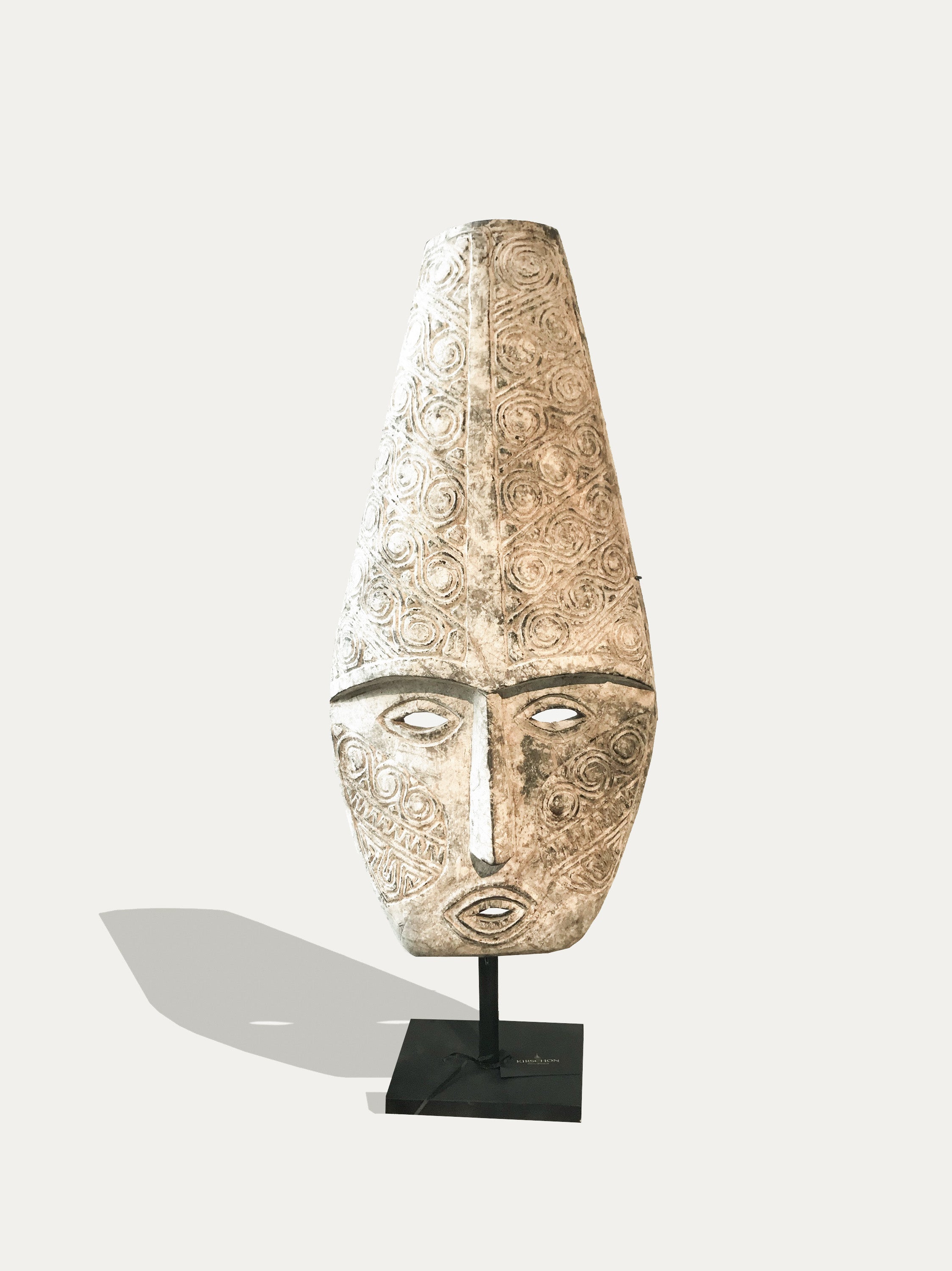 Ce masque en bois sculpté à la main provient de la magnifique île de Sumba, en Indonésie, et présente certains des motifs de sculpture traditionnels de l'île.