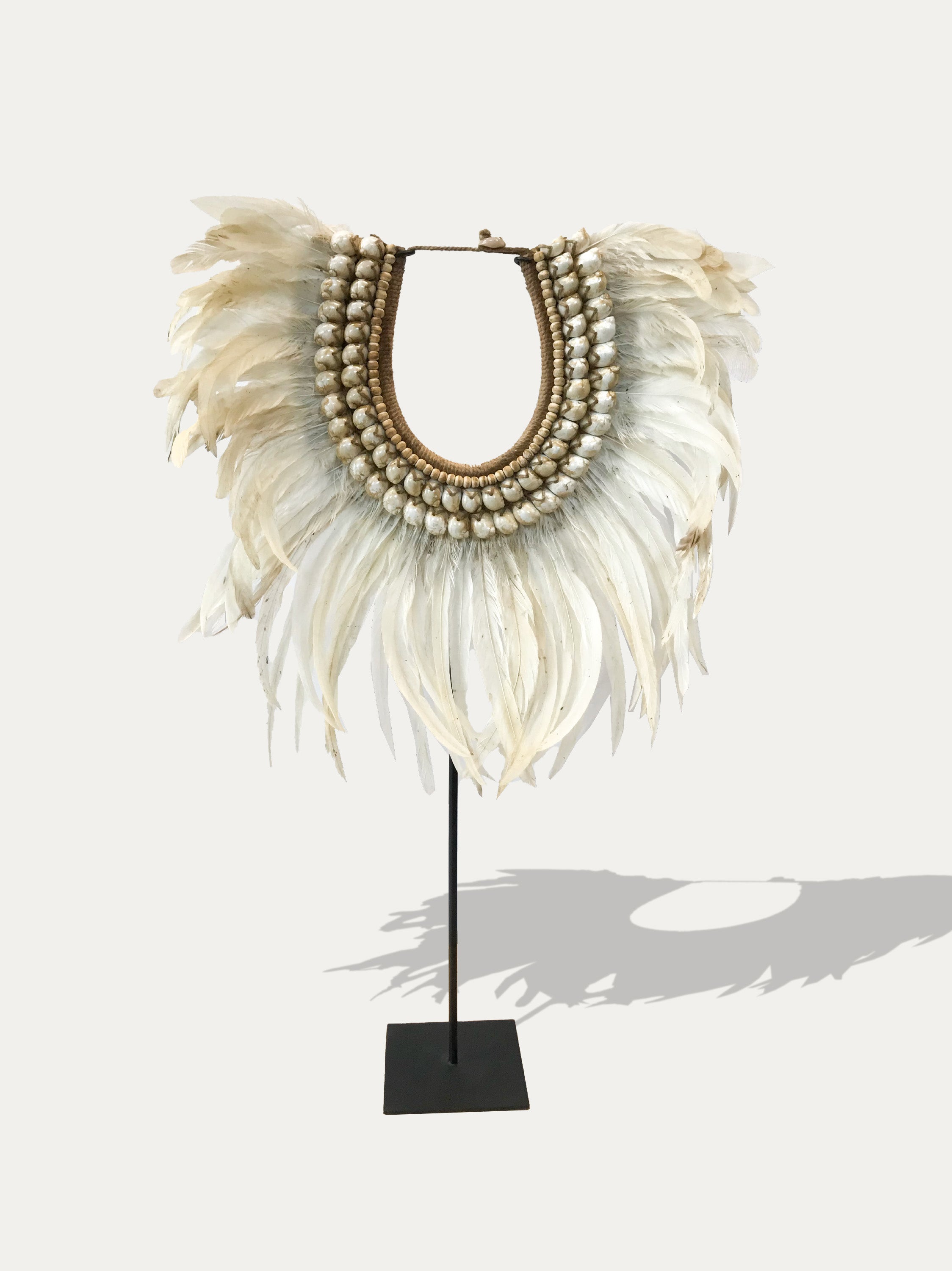 This set of necklaces comes from Papua in Indonesia and is made out of rooster feathers and shells embroidered on to natural fiber crochet bases. Necklaces like these are symbols of the bond between humans and nature, used during big ceremonies. In several myths, the rooster has the power to revive the dead or to make a wish come true. It is considered sacred within the spiritual realm.